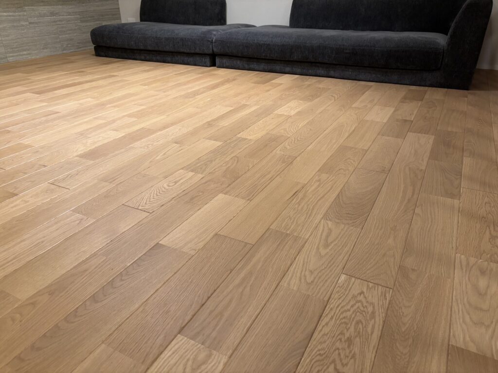 私たちは展示場のオイル塗装の床に一目惚れ、最終的にオイル塗装を採用しました!