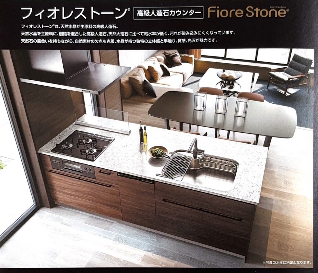 ステンレスのイメージが強いクリナップですが、高級人造石の「フィオレストーン」のカウンターを標準仕様で選ぶことができます。